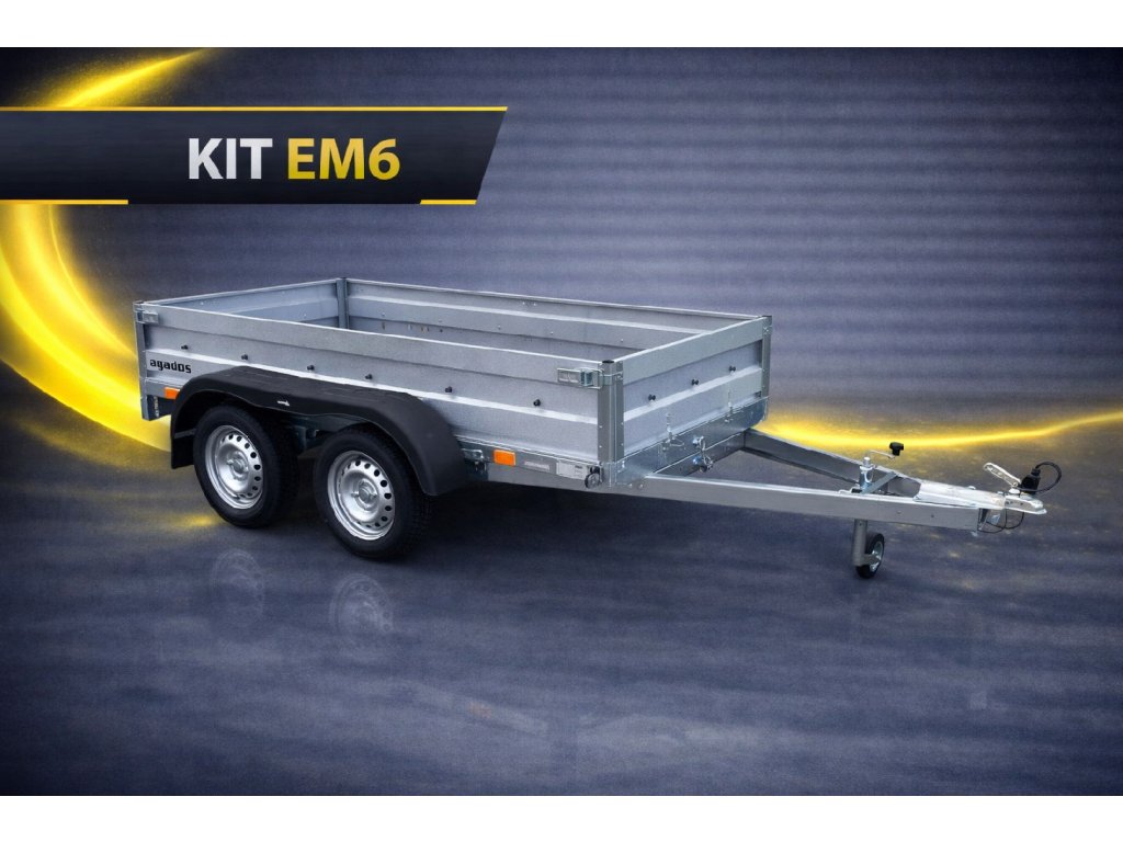 Přívěs AGA KIT EM6 představuje kompromis mezi cenou a robustním provedením. Jedná se o nebrzděný přívěs s odolným celo-svařovaným rámem se čtyřmi příčkami pod podlahou. Podlaha samotná je pak z voděodolné překližky o síle 9 mm. Základní výbava zahrnuje: