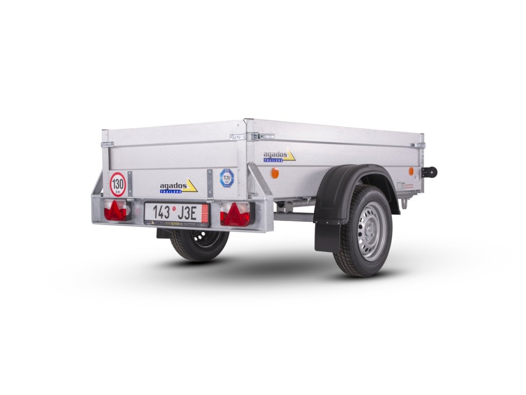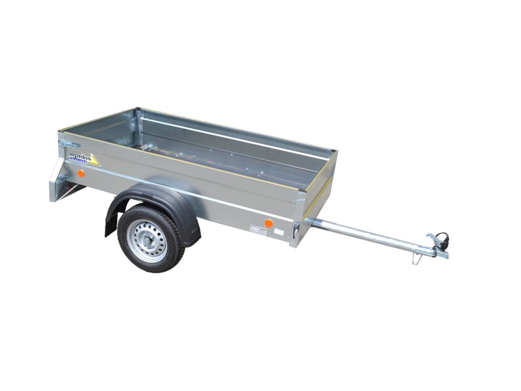 Nebrzděný přívěs s celkovou hmotností 750 kg. Ložná plocha 2650x1240x400 mm. Provedení s "V" ojí, plechové bočnice 400 mm s Al-Zn úpravou, 13" kola, 7pólová elektroinstalace, podlaha je vyrobená z voděodolné překližky o síle 15 mm, 4 ks kotvících ok