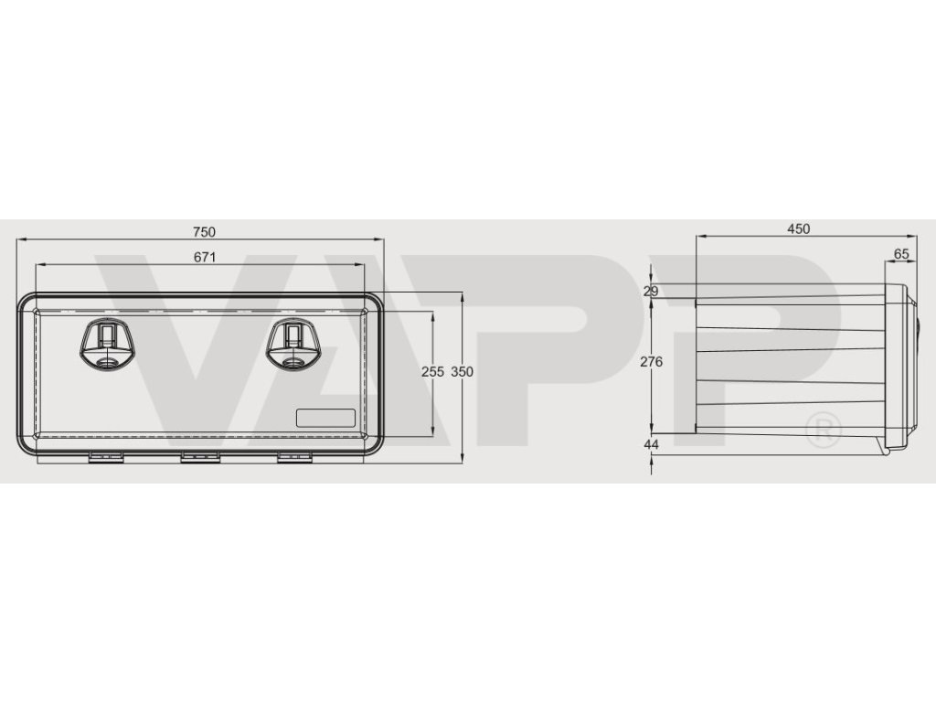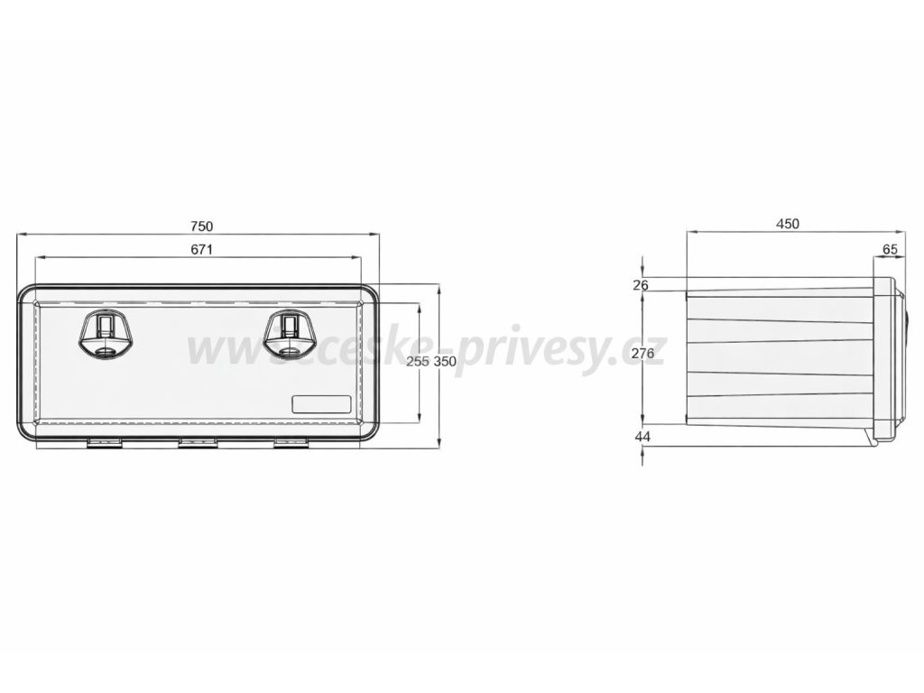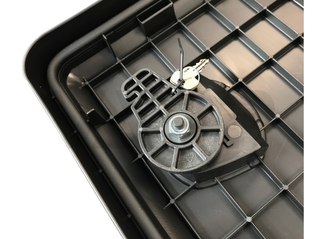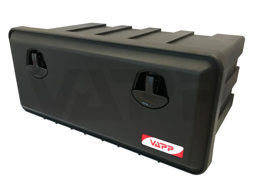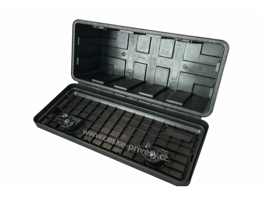 Vyroben z odolného plastu, který je lehký, pevný a vhodný pro dlouhodobé venkovní použití. Konstrukce je optimalizována pro montáž na přívěsy, vozíky a přívěsnou techniku, kde je kladen důraz na funkčnost, jednoduchou obsluhu a spolehlivost. Uzavíratelné provedení zajišťuje, že uložené vybavení zůstává stabilní a chráněné během přepravy i manipulace.