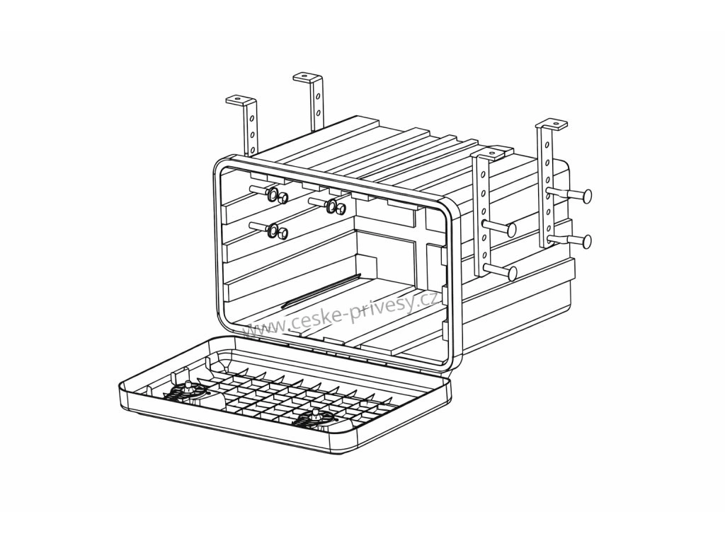 Konstrukce držáku boxu pod přívěs je vyrobena z pevného materiálu s vysokou mechanickou odolností, který je navržen pro dlouhodobé zatížení, působení vibrací, vlhkosti a běžných povětrnostních vlivů. Držák zajišťuje pevné spojení boxu s rámem přívěsu a minimalizuje riziko jeho posunu nebo poškození při jízdě.