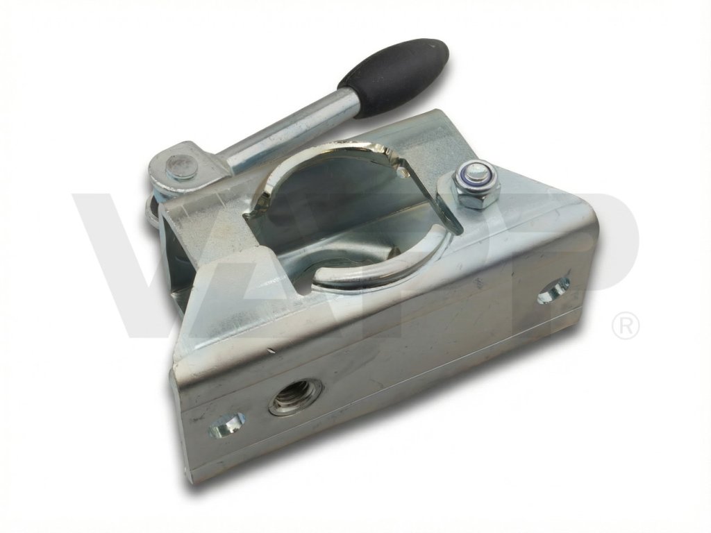 Držák opěrného kolečka VAPP 48 mm v plechovém provedení je navržen pro bezpečné a stabilní uchycení opěrného kolečka na oj přívěsu. Konstrukce držáku umožňuje pevné sevření kolečka a zajišťuje jeho spolehlivou funkci při parkování, připojování i ruční manipulaci s přívěsem.