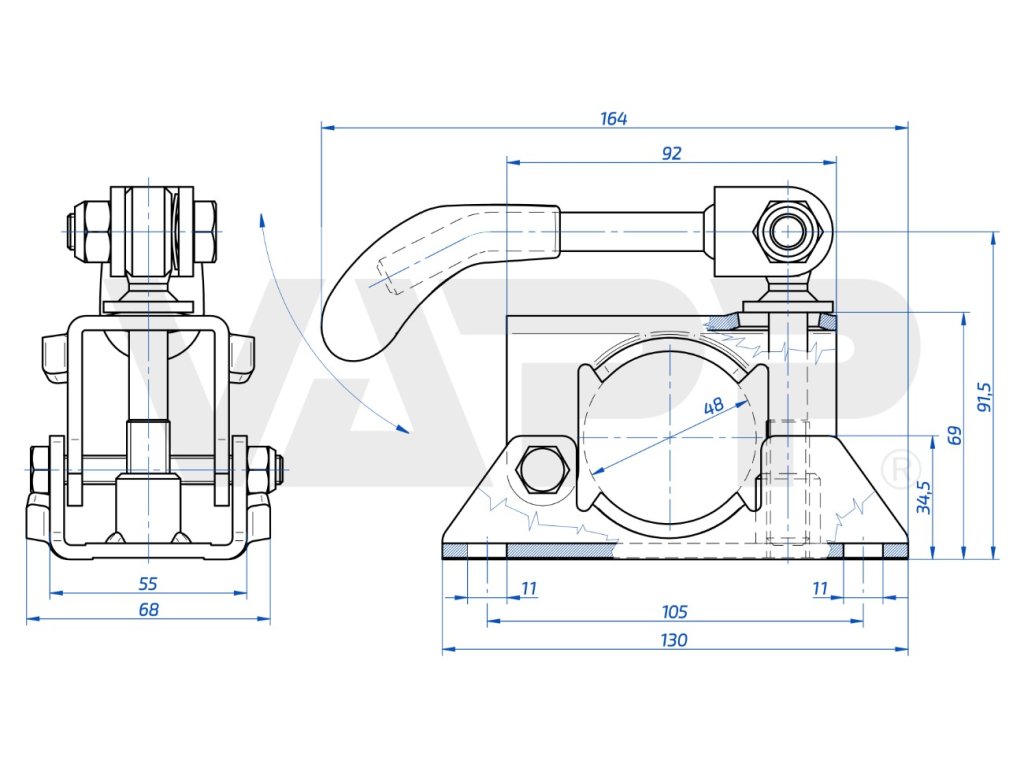 Držák opěrného kolečka VAPP 48 mm – plech se sklopnou kličkou je vhodný pro montáž i výměnu opěrného kolečka na přívěsu, kde je kladen důraz na funkčnost, snadnou manipulaci, bezpečné uchycení a dlouhodobě spolehlivý provoz přívěsné techniky.