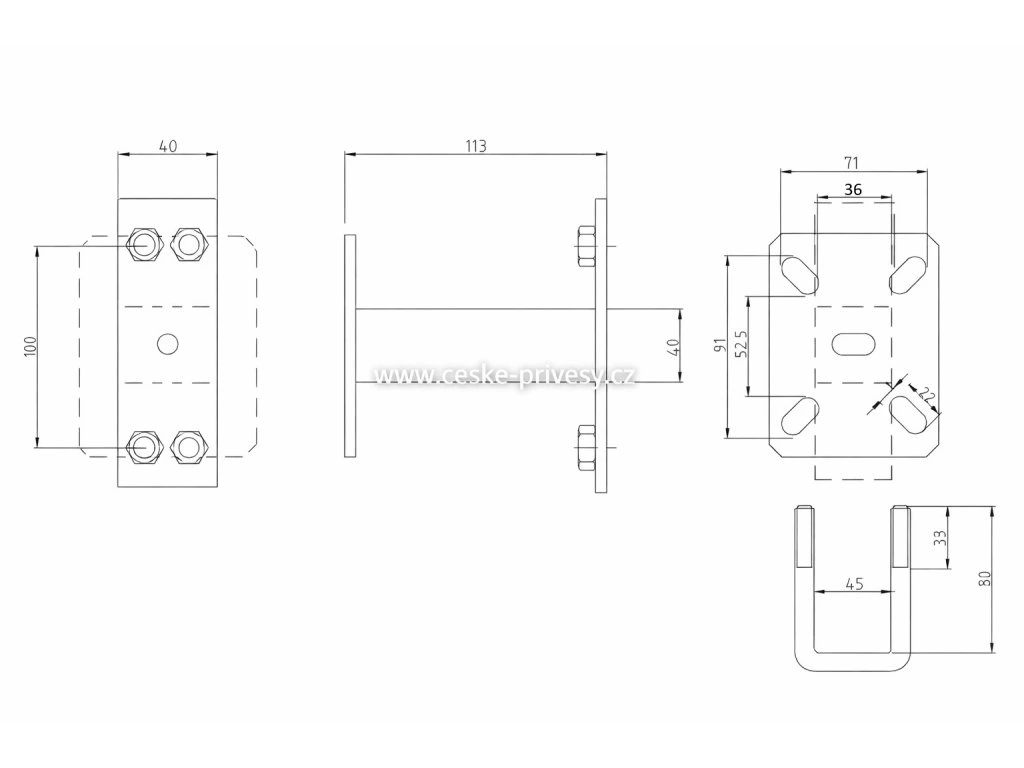 - Držák je určený pro kolový úchyt 100x4 (čtyřděrový úchyt, osová rozteč kolových šroubů měřená přes střed kola je 100 mm)