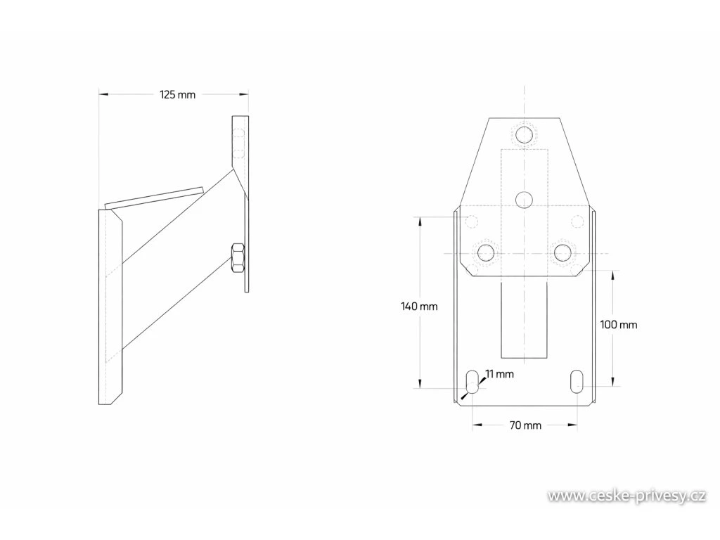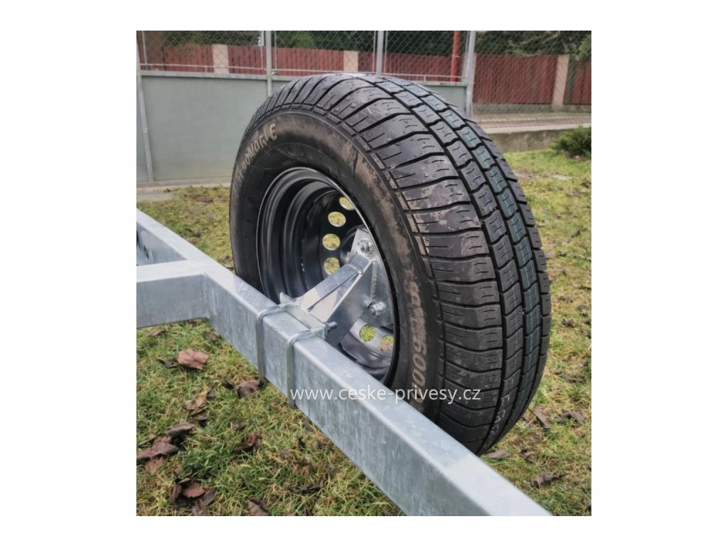 Konstrukce držáku rezervního kola je zhotovena z pevného materiálu s vysokou mechanickou odolností, který je odolný vůči vibracím, mechanickému namáhání a běžným povětrnostním vlivům během provozu přívěsu. Držák pevně zajišťuje kolo v požadované pozici a minimalizuje riziko jeho pohybu či poškození při jízdě.