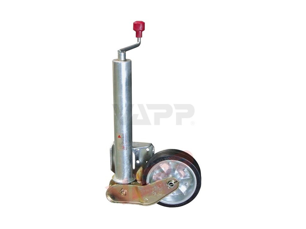 Automaticky sklopné opěrné pojezdové kolečko AL-KO s navařenou přírubou pro přišroubování, žárově pozinkované. délka vysunutí: 245 mm + 230 mm (výklop) Otáčením horní kličky se kolečko začne posunovat směrem dolů a vyklápět. V okamžiku, kdy je kolečko zcela vyklopené, dojde k jeho automatické aretaci ve vyklopené poloze. Při zasouvání kolečka otáčením horní kličky se kolečko automaticky odaretuje a začne se sklápět. Kolečko lze zatěžovat až v okamžiku, kdy je aretovaný výklop. Pokud není pod kolečkem dost místa pro jeho vyklopení, neproběhne automatická aretace výklopu a kolečko se při zatížení sklápí zpět. ||| Kompatibilní s ETI: 807058, 807089 |||