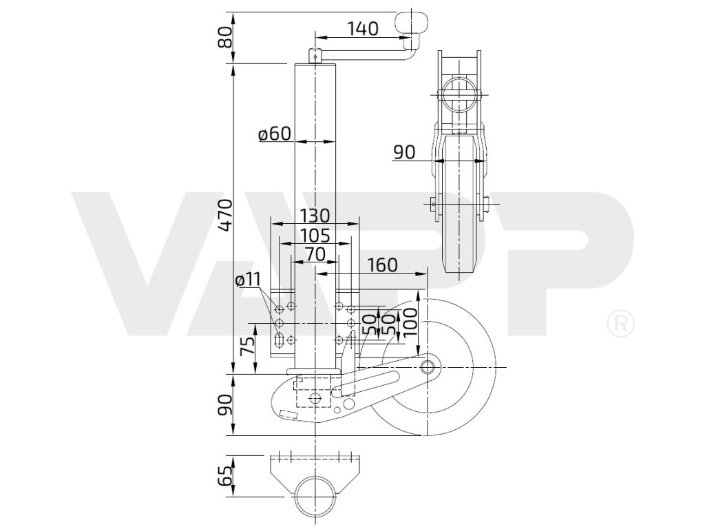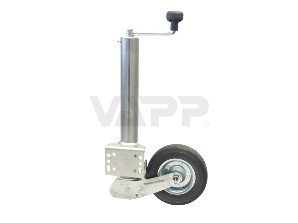 Automaticky sklopné opěrné pojezdové kolečko s navařenou přírubou pro přišroubování. délka vysunutí: 275 mm + 235 mm (výklop) Otáčením horní kličky se kolečko začne posunovat směrem dolů a vyklápět. V okamžiku, kdy je kolečko zcela vyklopené, dojde k jeho automatické aretaci ve vyklopené poloze. Při zasouvání kolečka otáčením horní kličky se kolečko automaticky odaretuje a začne se sklápět. Kolečko lze zatěžovat až v okamžiku, kdy je aretovaný výklop. Pokud není pod kolečkem dost místa pro jeho vyklopení, neproběhne automatická aretace výklopu a kolečko se při zatížení sklápí zpět. Po vyklopení a vysunutí se výsuvná část protáčí kolem svislé osy. Při manipulaci a pojíždění s přívěsem lze tak snadno měnit směr jízdy.