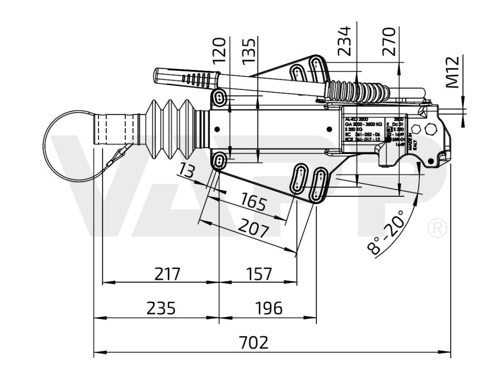 Tato nájezdová brzda je určena pro spodní i horní montáž na oje tvaru "V", t.j. brzdu lze osadit na oj z horní i ze spodní strany. Robustní těleso nájezdové brzdy je vyrobeno z litiny a je opatřeno přípravou pro montáž držáku opěrného kolečka. Držák opěrného kolečka není součástí dodávky a lze ho objednat samostatně. *pozor: při použití spojovacího zařízení s nižším povoleným svislým zatížením je nutné respektovat zatížitelnost spojovacího zařízení! To se týká typicky tažných kulových spojek, které obvykle mívají povolené svislé zatížení maximálně 150 kg.