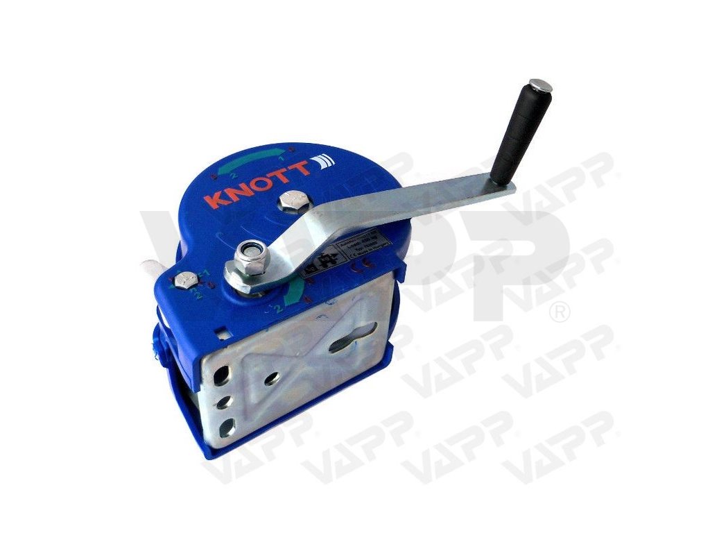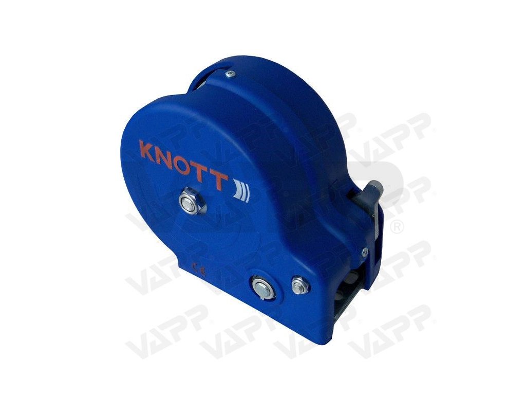 Naviják KNOTT s jedním převodem a ruční brzdou. Západka sloužící k zabrždění lze také zaaretovat v opačné poloze a lano pak lze snadno odvíjet bez nutnosti točit ručně klikou.