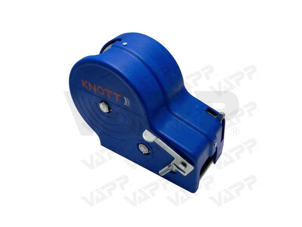 Naviják KNOTT se dvěma převody a ruční brzdou. Západka sloužící k zabrždění lze také zaaretovat v opačné poloze a lano pak lze snadno odvíjet bez nutnosti točit ručně klikou.