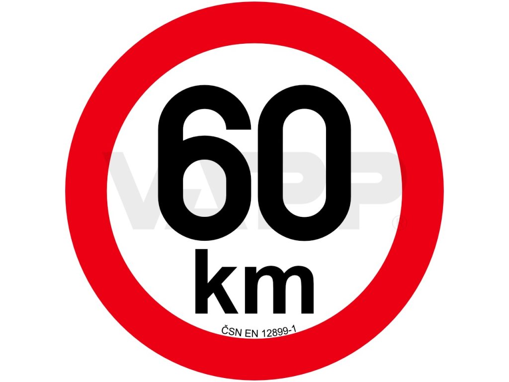 Samolepka průměr 200 mm s označením nejvyšší povolené rychlosti 60 km/h v provedení z retroreflexní fólie třídy 1 dle ČSN EN 12899-1, odpovídající platnému znění vyhlášky 153/2023 Sb. Vozidla kategorií M2, M3, N2, N3, O, R, S, C, T a Z s výjimkou čelně nesených strojů kategorie SN a jednonápravové traktory s přívěsy a speciální nosiče pracovních adaptérů musí být vybavena na zádi karoserie, a to pokud to konstrukce vozidla dovoluje, v levé polovině označením nejvyšší povolené rychlosti. 1. Vozidla kategorií M2, M3, N2, N3, O, R, S, C, T a Z s výjimkou čelně nesených strojů kategorie SN a jednonápravové traktory s přívěsy a speciální nosiče pracovních adaptérů musí být vybavena na zádi karoserie, a to pokud to konstrukce vozidla dovoluje, v levé polovině označením nejvyšší povolené rychlosti zaokrouhlené 2. Označení nejvyšší povolené rychlosti je v provedení kruh bílé barvy, který je lemován červenou barvou o vnějším průměru 200 mm; písmena v kruhu, pokud jsou použita, musí mít výšku "k" 35 mm, "m" 24 mm, číslice 75 až 80 mm, tloušťku čáry písmen 6 mm a číslic 12 mm. Barva nápisu je černá. Označení nejvyšší povolené rychlosti musí být vždy čitelné a při provozu nesmí být zakryto. Označení se vyžaduje z retro reflexního materiálu třídy 1 podle ČSN EN 12899-1, tedy červená a bílá, písmena a číslice jsou nereflexní. Retroreflexní materiál se nevyžaduje u vozidel, u kterých je provoz za snížené viditelnosti zakázán, u zvláštních vozidel a nesených strojů. 3. Není-li možno u přípojných vozidel kategorie O1, O2, R, vozidel kategorie S, jednonápravových traktorů s přívěsem a speciálních nosičů pracovních adaptérů umístit označení o průměru 200 mm, je přípustné použít označení o vnějším průměru 150 mm; potom písmena v kruhu, pokud jsou použita, musí mít výšku "k" 20 mm, "m" 14 mm, číslice 75 až 80 mm, tloušťka čáry je u písmen 3,5 mm a u číslic 12 mm. Pozor, tato samolepka nesplňuje požadavky Nařízení vlády Slovenské republiky č. 349/2009, proto není vhodná k použití na Slovensku.Výňatek z vyhlášky 153/2023 Sb. (Příloha 7, písmeno G):