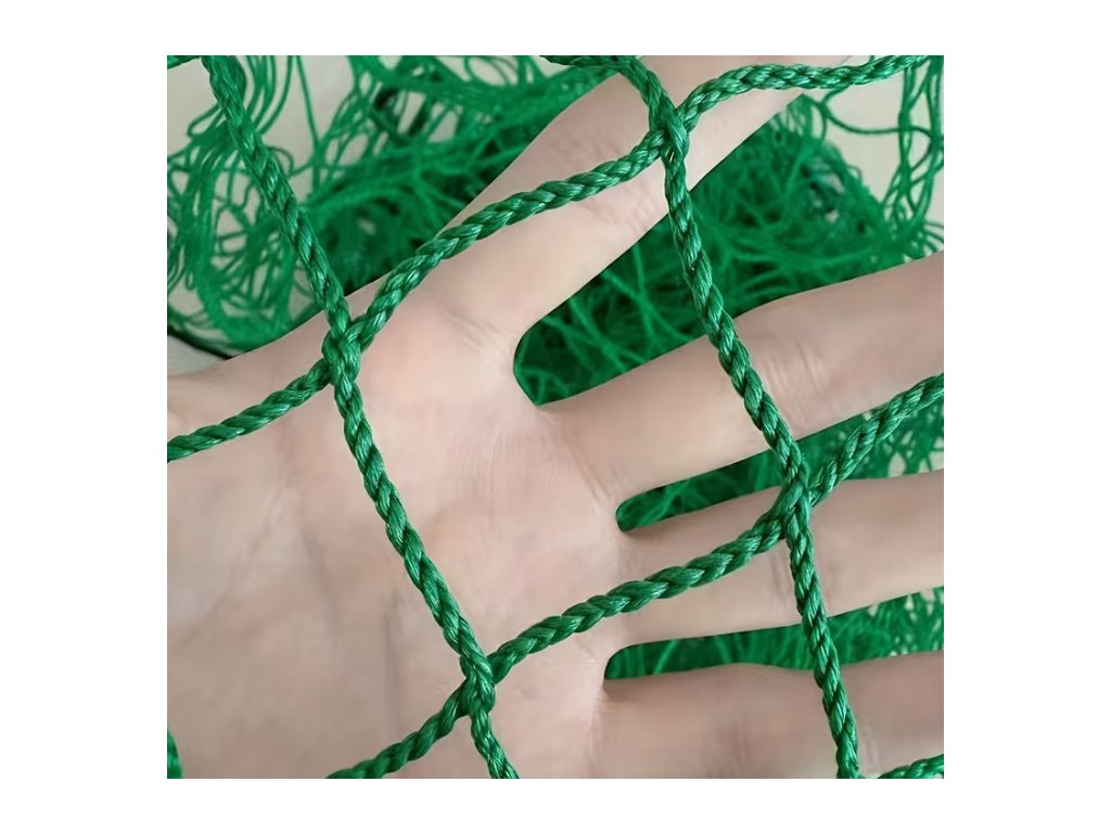 - Zelená PE síťovina s oky 35x35 s obvodovým zesíleným lanem a prošitím v červené barvě pro snazší orientaci při nasazování.