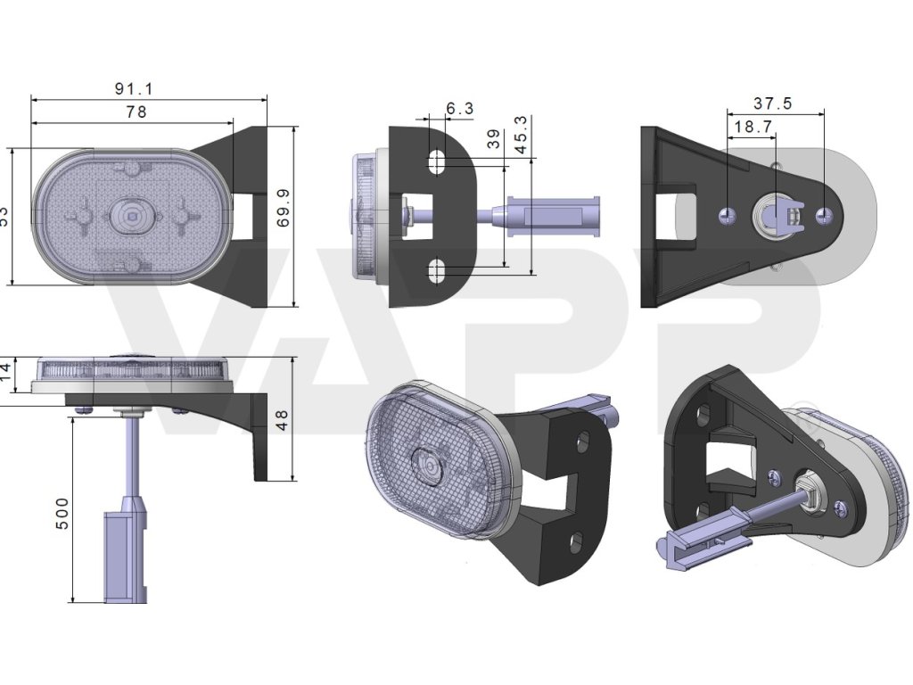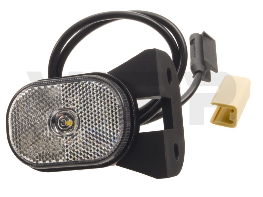 Přední obrysová svítilna s integrovanou odrazkou na držáku. Díky LED technologii odolné vůči provozním vibracím a povětrnostním vlivům odpadají starosti s uklepanými žárovkami. Flexibilní měkký držák lze použít pro montáž zboku na levou či pravou stranu, nebo podvěsem. Ze svítilny je vyveden 50cm kabel zakončený konektorem QS150 - tedy rychlospojkou pro snadnou montáž na plochý kabel 1,5mm2. Součástí balení je SNAP-IN protikus. Pozor, tato svítilna má provozní napětí 12V! Nelze používat za vozidly o provozním napětí 24V! Schéma použití QS spojek: Zapojení SNAP-IN koncovky: pin označený "+": hnědý vodič (alternatině černý) pin ozančený "-": modrý vodič (alternativně bílý)