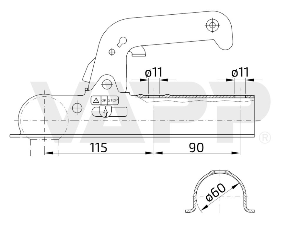 Standardní tažná spojka 800 kg pro nebrzděné přívěsy. Určená pro montáž na trubku průměr 60 mm. Ovládací madlo je opatřeno stiskací pojistkou a otvorem pro zámek WW DBS 8/AK7. Spojka je po dobu své životnosti samostavitelná a není nutné ji seřizovat. Míra opotřebení tažné spojky, resp. kulového čepu je zobrazena na přehledném bočním ukazateli. rozteč montážních otvorů je 90 mm. NEZAPOMEŇTE: Pravidelným mazáním a čištěním výrazně prodloužíte životnost tažné kulové spojky.