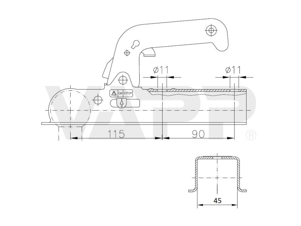 Tažná spojka Winterhoff WW 8-D45, 800 kg, 45x45 mm, V10