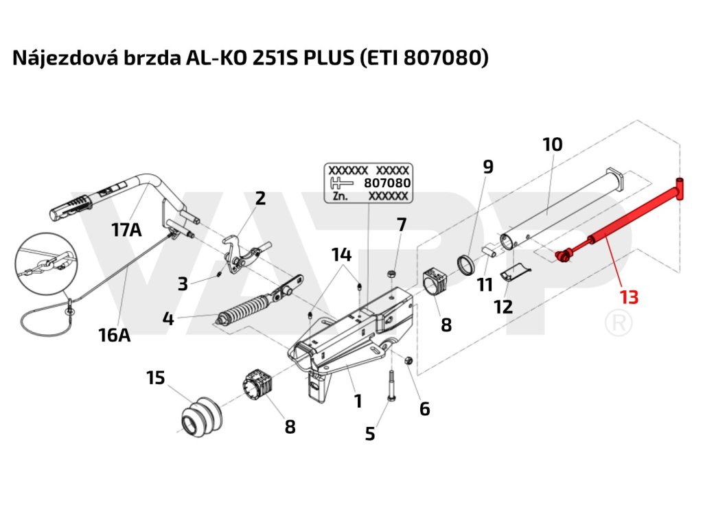 Dvojčinný plynokapalinový tlumič pro nájezdovou brzdu AL-KO typ 251S PLUS do 2700 kg celkové hmotnosti přívěsu. Tlumič je uložený uvnitř tažné trubky nájezdové brzdy a zajišťuje plynulý náběh brzdění a odbrzďování přívěsu. Tlumení je účinné v obou směrech pohybu - při stlačování i při roztahování. Stlačený tlumič se rozpíná pomalu vlastní silou. Při výměně tlumiče doporučujeme provést kontrolu dorazového kroužku, osazeného na konci tažné trubky a provést seřízení kolových brzd. Brzdový systém nechte seřizovat pravidelně, příliš velká vůle brzdového systému výrazně snižuje životnost tlumiče nájezdové brzdy. POZOR: Tento tlumič lze použít pouze pro inovovanou brzdu 251S PLUS (ETI 807080). Nelze jej použít na starší typ 251S. ||| Kompatibilní s ETI: 807070, 807072, 807077, 807078, 807080, 807086, 807101, 807121, 807126 |||